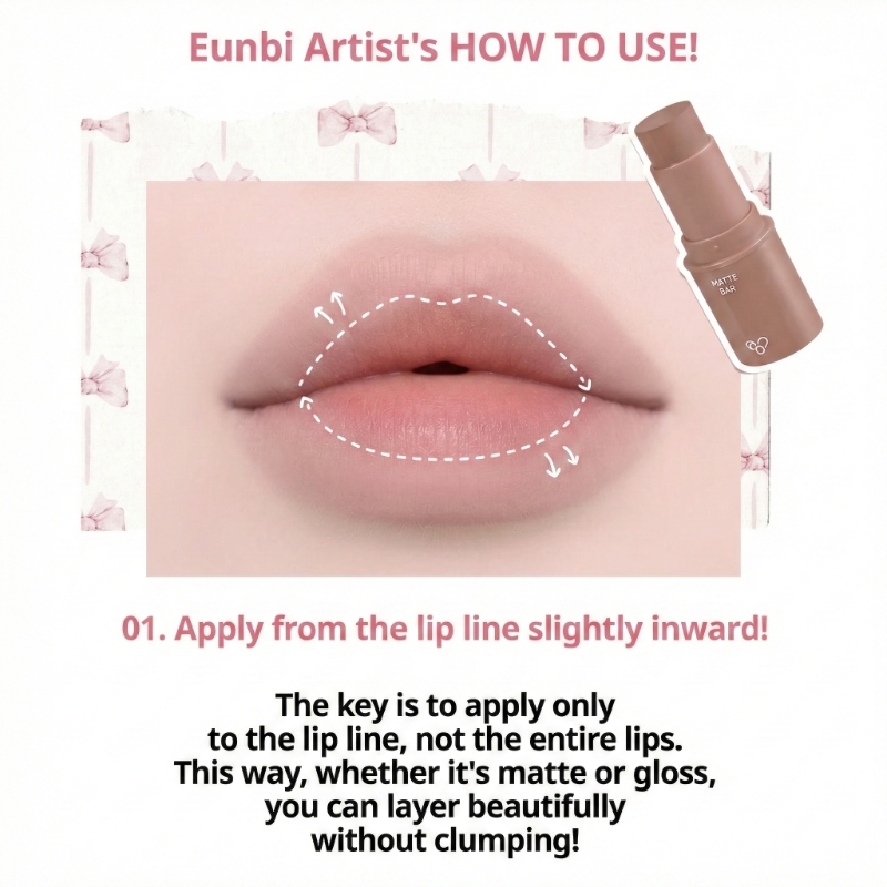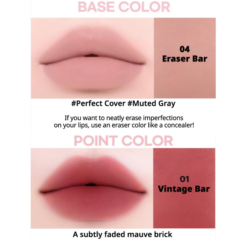 | 04 Eraser Bar | Lip Corrector / Neutralizer | A unique “eraser” shade designed to neutralize pigmented lip lines or dark spots. It creates a clean canvas for gradient lip art. |