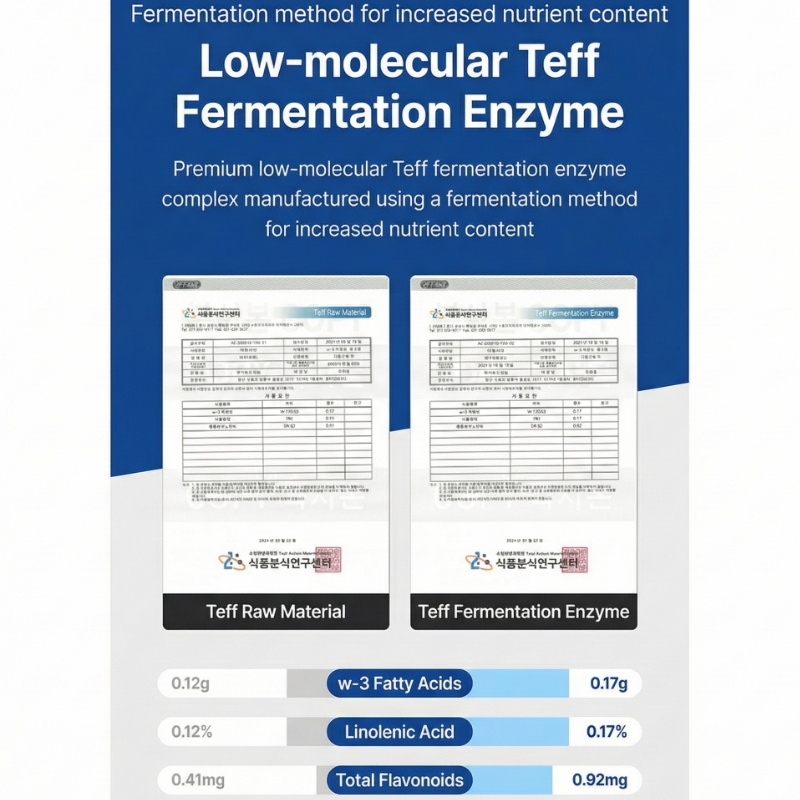| Ingredients | Low Molecular Teff Fermented Enzyme Premium Complex[36-Type Teff Fermented Enzyme (Teff (Australia),Yellow Bean,Defatted Soybean,Rice,Plum Wheat Firming Powder),Low Molecular Teff Fermented Enzyme (Teff (Australia),Probiotics,Saccarifying Mold A(Bacillus subtilis))], Fructooligosaccharides (Israel),5-Grain Powder[Brown Rice (Korea),Barley (Korea),Sorghum,Millet,Glutinous Brown Rice],Isolated Soybean Protein (Isolated Soybean Protein,Lecithin),Bamboo Sap Extract Powder,Tri Calcium Phosphate, Concoction 1 (Flavor,Lactic Acid),Enzymatically Modified Stevia,Arabic Gum,Psyllium Husk Dietary Fiber,Banana Leaf Extract,Helianthus tuberosus Powder,Concoction 2[Calcium Phosphate, Dibasic,Vitamin C,Ferrous Fumarate,Vitamin E Concoction (dl-a-Tocopheryl Acetate,Dextrin,Food Starch Modified,Silicon Dioxide),Nicotinamide,Zinc Oxide,Powdered Vitmain A Concoction (Dextrin,Arabic Gum,Zea Mays (Corn) Starch,Powdered Vitmain A Concoction (Dextrin,Arabic Gum,Zea Mays (Corn) Starch,Power Vitamin A,Vitamin E),Vitamin B6 Hydrochloride,Vitamin B1 Hydrochloride,Vitamin B2, Folic Acid].Brassica Oleracea Capitata (Cabbage) Concentrate Powder,Green Plum Concentrate Powder,Heat-Killed Probiotics, Lactiplantibacillus plantarum,Probiotics Mix Powder,Lactulose Powder,Probiotics (Lactopleasure) Contains milk, buckwheat, soybean, wheat, tomato |