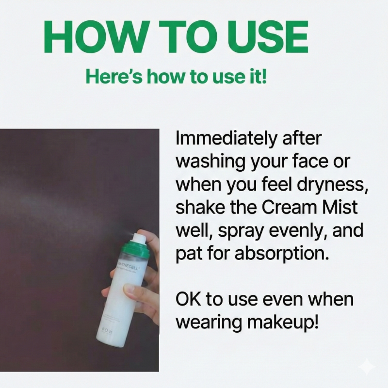 After cleansing, shake well the cream mist and evenly spray to absorb on dry skin.