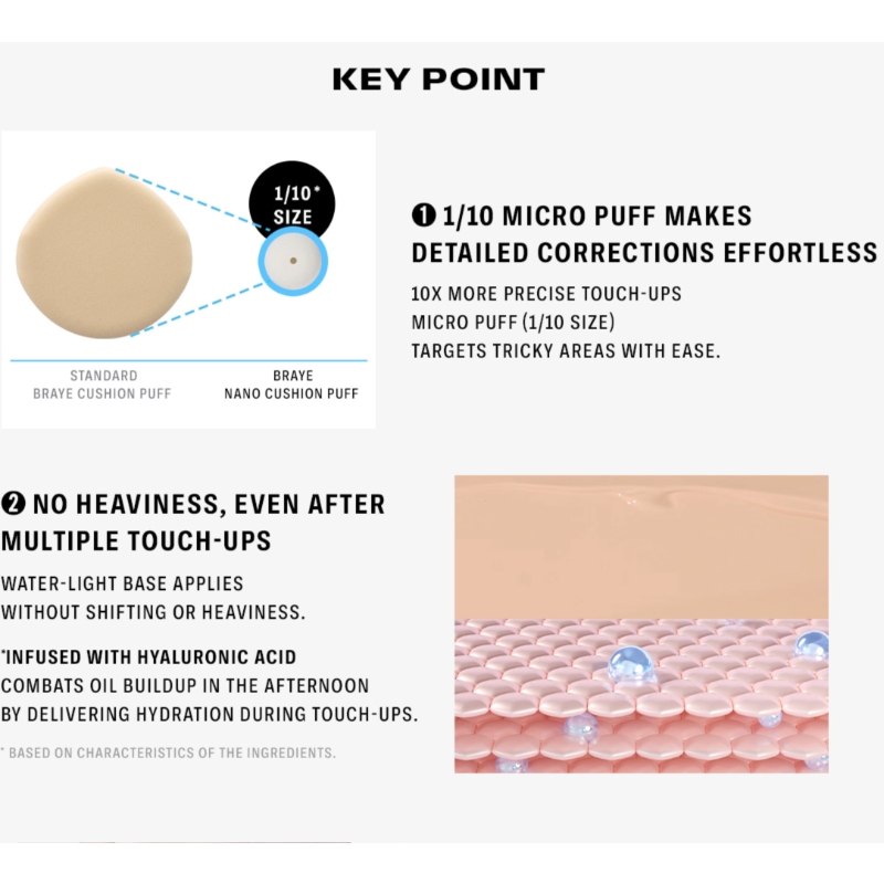 BRAYE NANO CUSHION’S 1/10 micro puff makes detailed corrections effortless and targets tricky areas with ease.