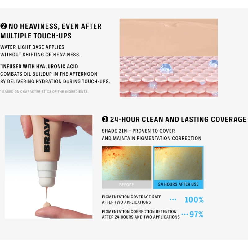 BRAYE NANO CORRECTOR works on both small and large trouble areas. Slim-fir coverage that feels like a single thin layer.