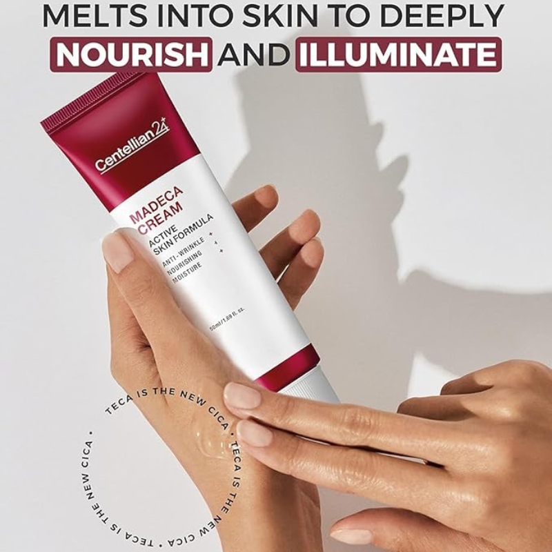 - CENTELLIAN 24 MADECA CREAM (SEASON 5) – TECA (titrated extract of centella asiatica) and centella asiatica, coupled with hyaluronic acid, collagen, elastin, ceramide, and phospholipids help soothe and calm sensitive skin, while also helping reduce the appearance of fine lines, wrinkles, and other signs of visual aging making it a great age-defying solution for your daily skincare routine.