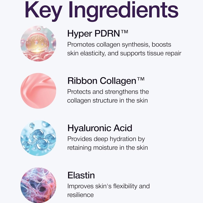 Ribbon Collagen™: A specialized collagen structure that works in synergy with PDRN to fill in fine lines and provide a scaffold for sagging skin, enhancing overall firmness.