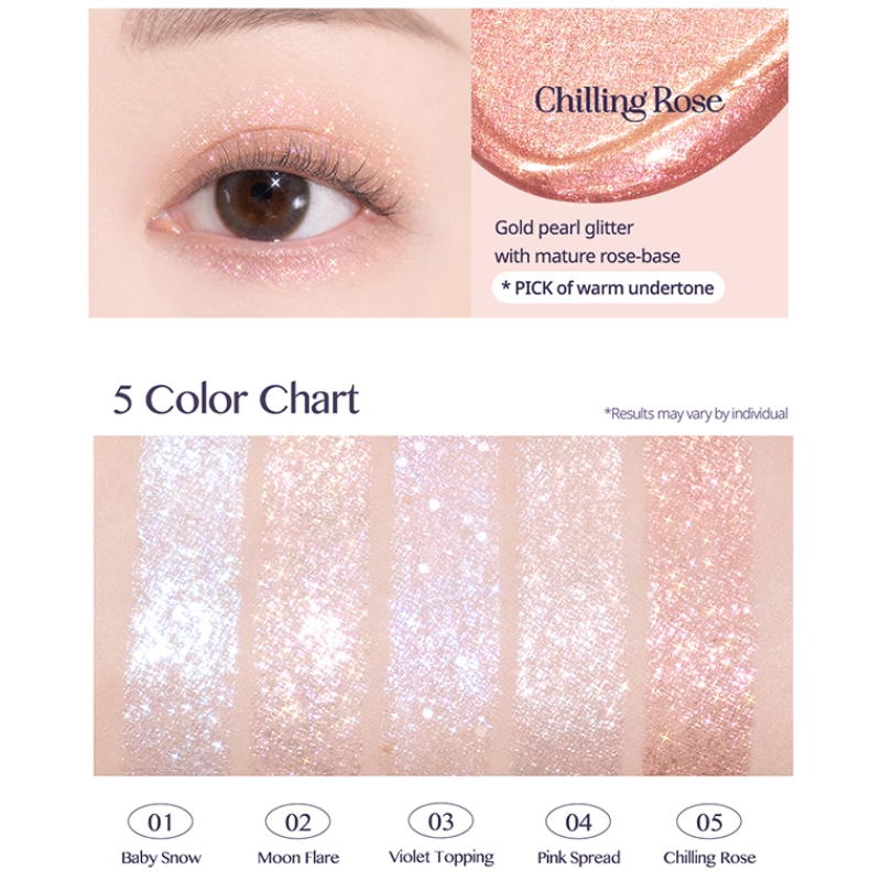 | Colour | #01 Baby Snow, #02 Moon Flare, #03 Violet Topping, #04 Pink Spread, 05 Chilling Rose |