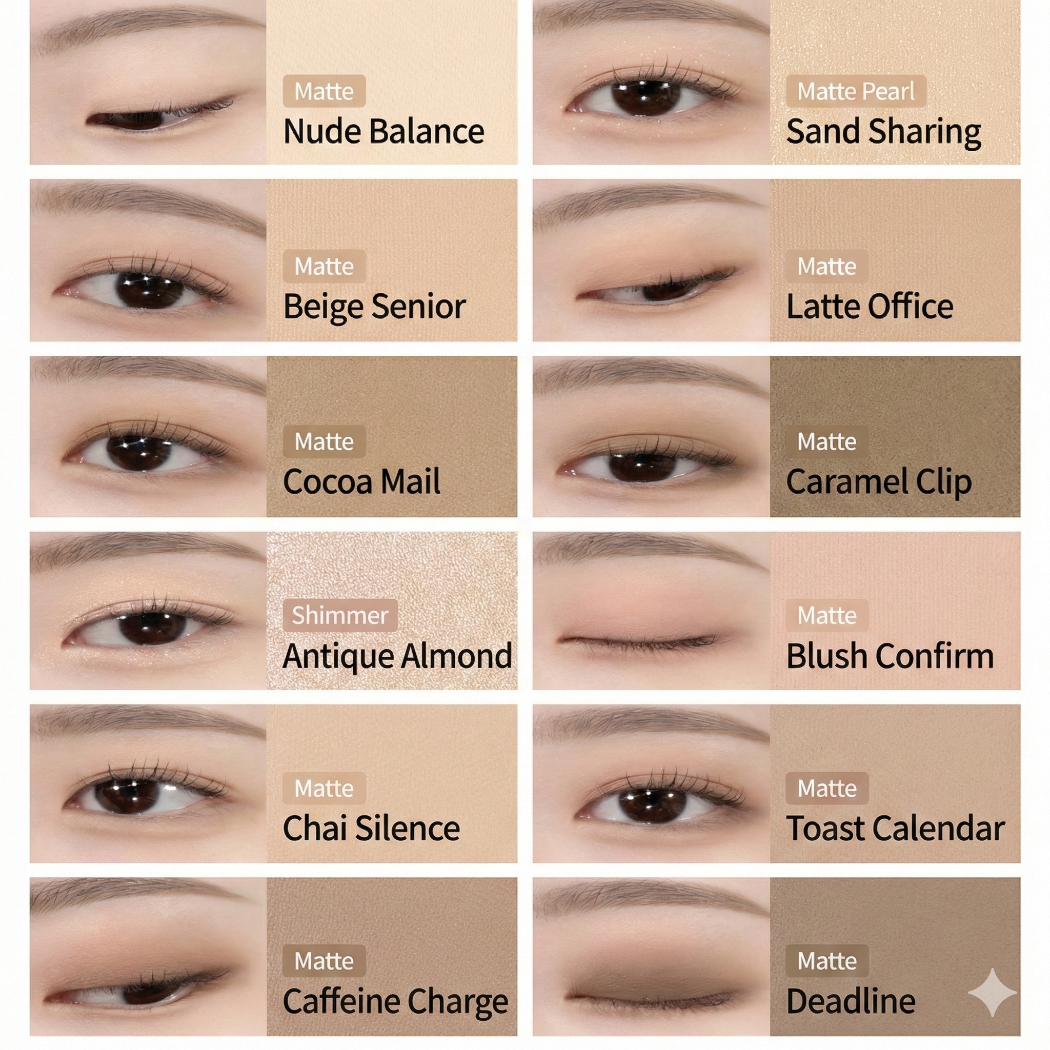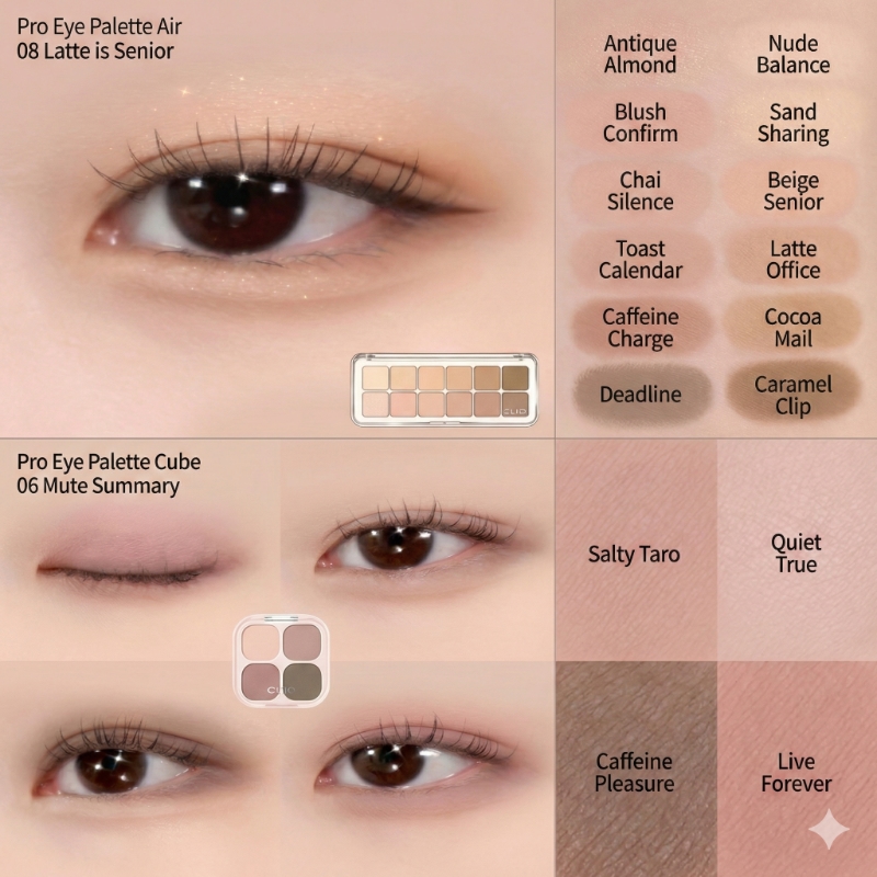 A refined palette for lovers of “quiet luxury” and neutral aesthetics. It features a spectrum of muted browns and creamy beiges that provide a natural contour, mimicking the soft shadows of a late-afternoon latte.