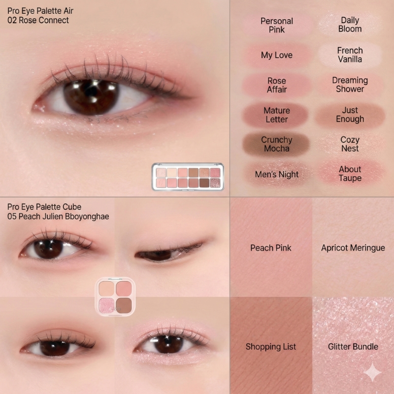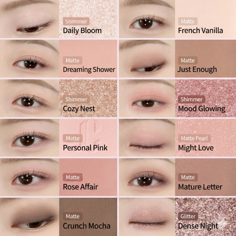A comprehensive 12-pan curation featuring ultra-fine pigments that glide onto the skin like air. This selection offers a harmonic blend of matte, shimmer, and glitter textures in warm, rosy hues designed to brighten the complexion effortlessly.