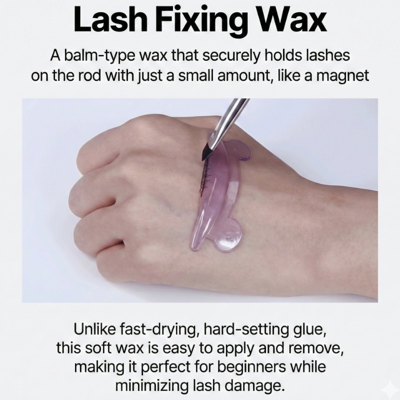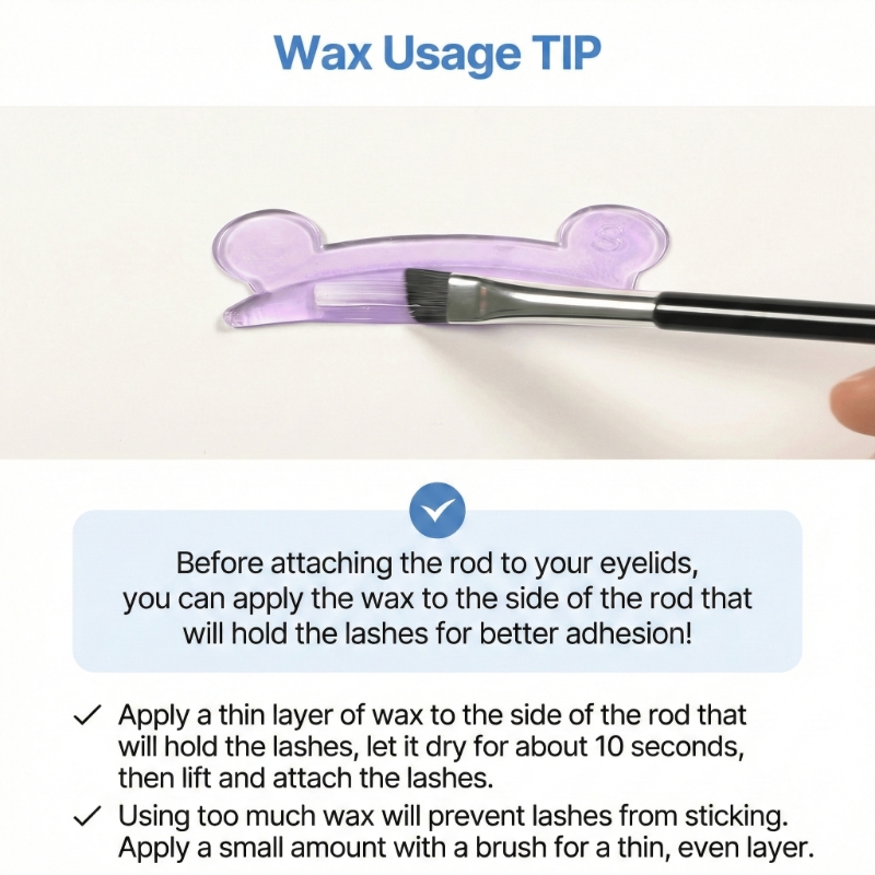 - Lash Attachment: Apply a thin layer of the fixative wax onto the rod, then gently lift and attach your lashes to the rod using the dual eye brush, ensuring they are neatly combed and separated.