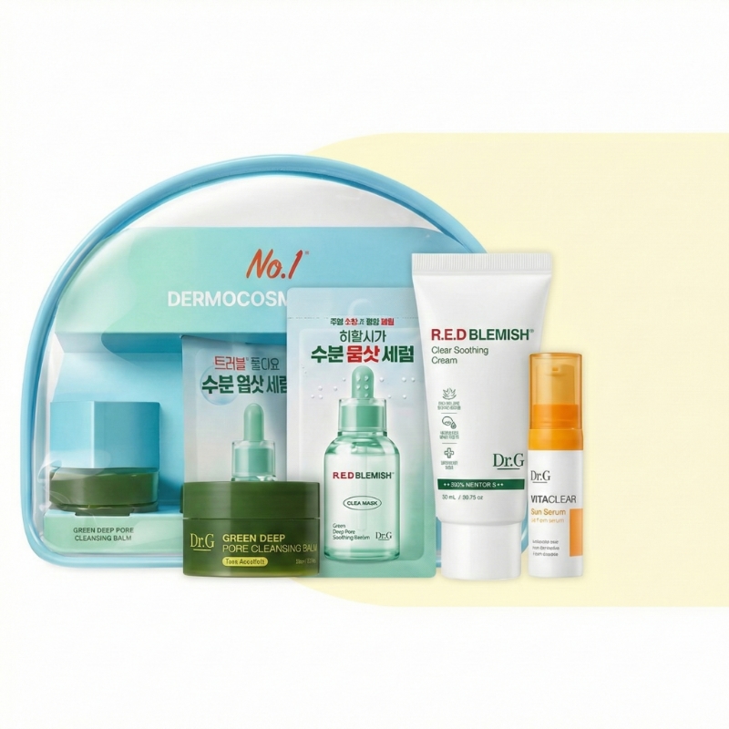This is a solid lineup from Dr.G, specifically designed for sensitive or acne-prone skin that needs soothing and hydration while traveling. Here is a breakdown of what each product in the Red Blemish Travel Set does: