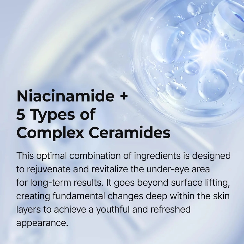 5-Type Ceramide Complex: Strengthens the skin’s natural moisture barrier, preventing dehydration and protecting the fragile eye area from environmental stressors.