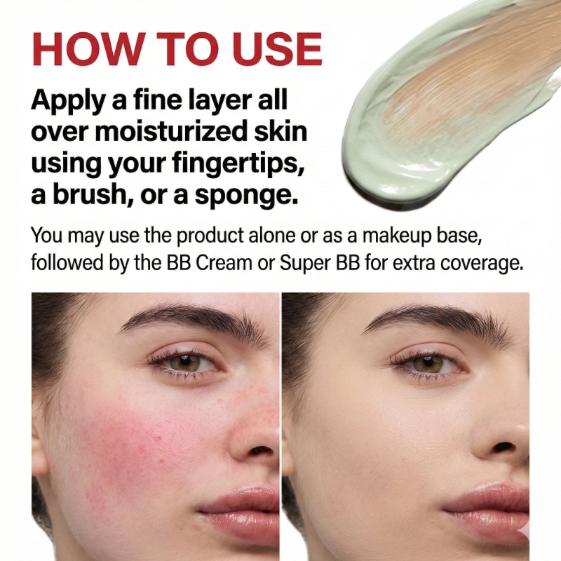 Instant Redness Neutralization: The specialized green pigments immediately blur the appearance of redness and imperfections.