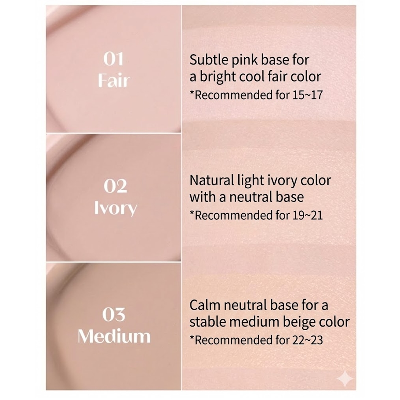 | Colour | [SET] 01 Fair (+Puff+Spatula), [SINGLE] 02 Ivory, [SET] 03 Medium (+Puff+Spatula) |