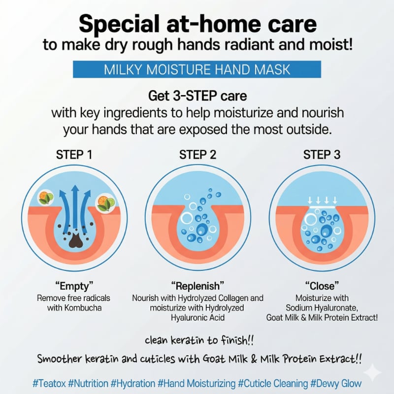 Hyaluronic Acid: Attracts and holds water in the deeper layers of the epidermis, ensuring hands stay plump and hydrated.