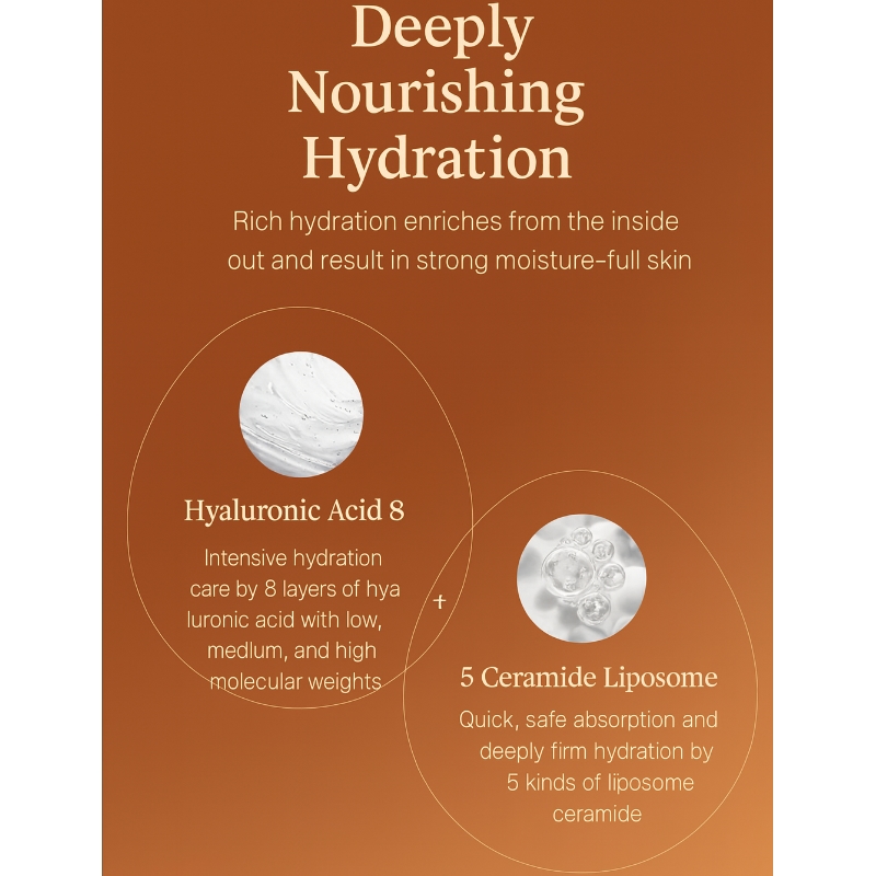 Deep Hydration and Barrier Reinforcement: The 8-layer Hyaluronic Acid complex completely fills both the outer and inner layers of the skin, providing profound moisture, while the 5 types of Ceramides firmly strengthen the skin’s protective barrier, preventing moisture loss and resolving dryness.