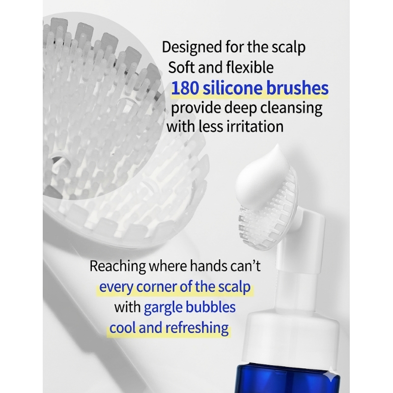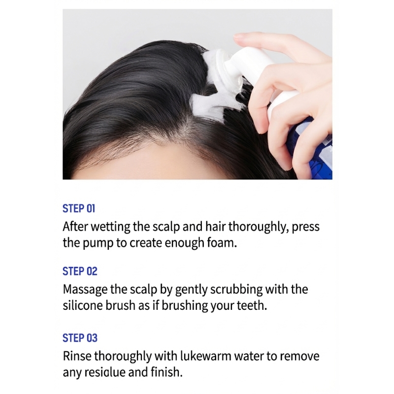 Massage: Gently massage the foam into your scalp with your fingertips for 2–3 minutes to activate the cooling bubbles and loosen impurities.
