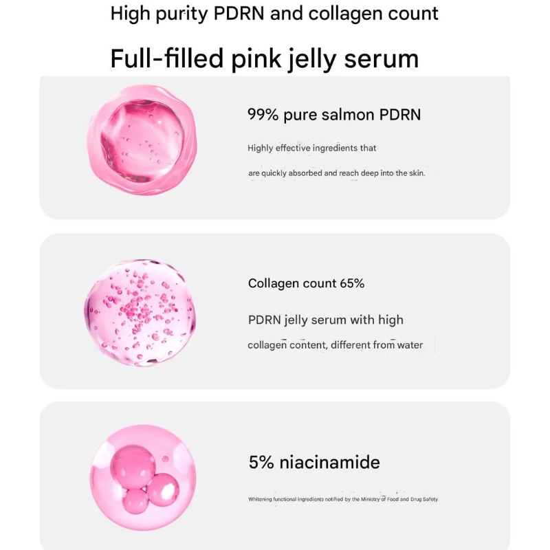 • Salmon PDRN (Polydeoxyribonucleotide): Extracted from salmon DNA, which shares a 95% similarity with human DNA. This powerhouse ingredient is renowned in dermatology for its ability to boost tissue regeneration and heal the skin barrier.