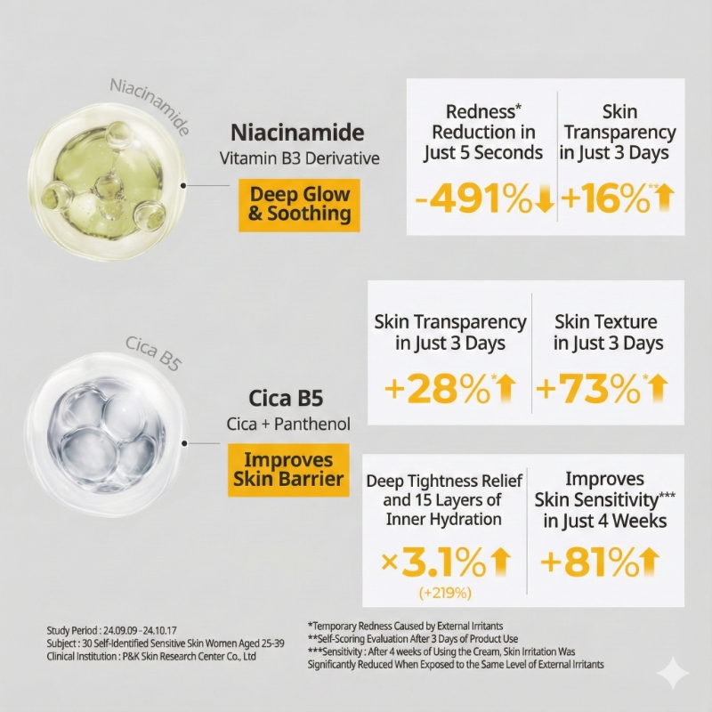 Cica (Centella Asiatica) & Madecassoside: Renowned herbal extracts that deeply soothe inflammation and accelerate skin recovery.