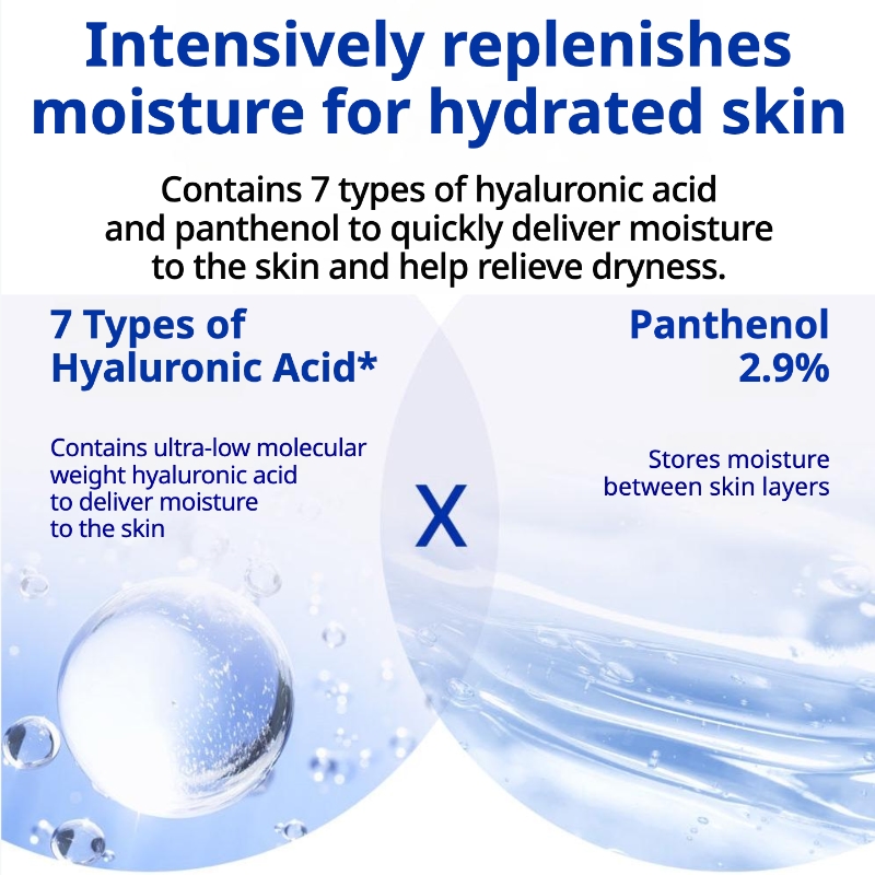 6 kinds of hyaluronic acids including ultra low molecular hyaluronic acids provide quick moisturizing to skin, while panthenol enhances moisture retention of skin to help with alleviating inner skin dryness.