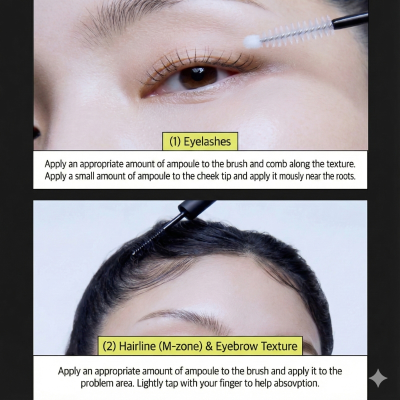 1. Eyelash: Apply ampoule on the brush and brush along lash texture. Apply little amount of ampoule to the ball tip and apply thoroughly close to lash roots.