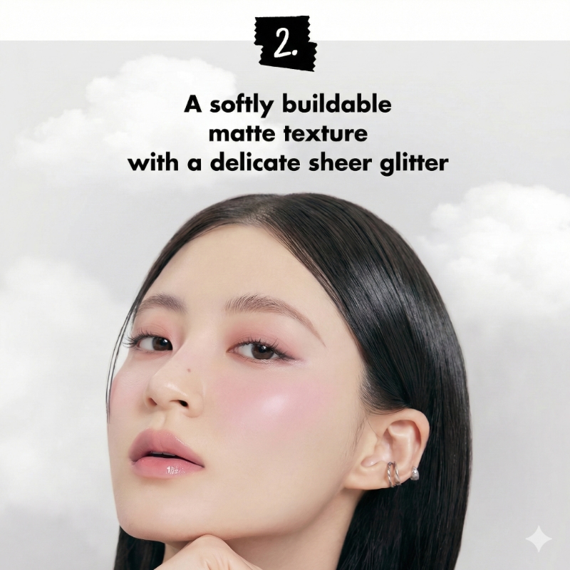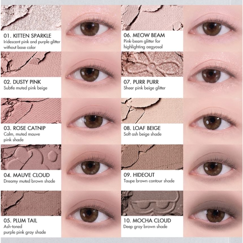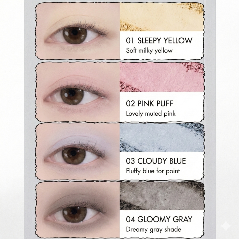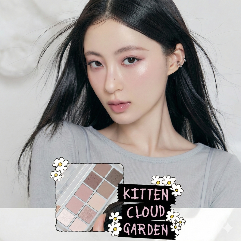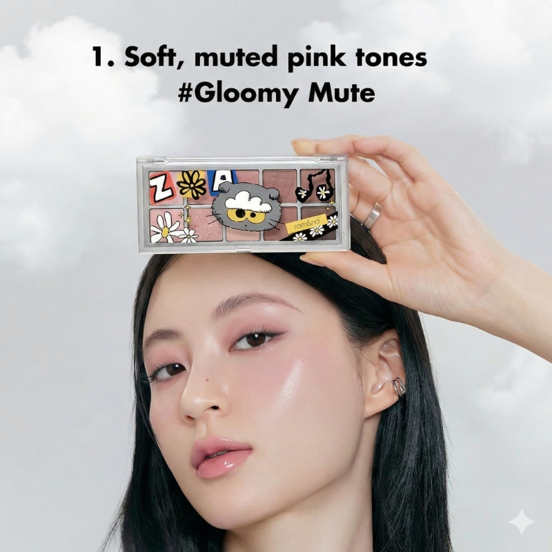 Main Palette: A collection of muted pinks, soft ash, and cloud-like violets. It creates a “soft-focus” filter effect that brightens cool-toned skin and adds a romantic mystery.