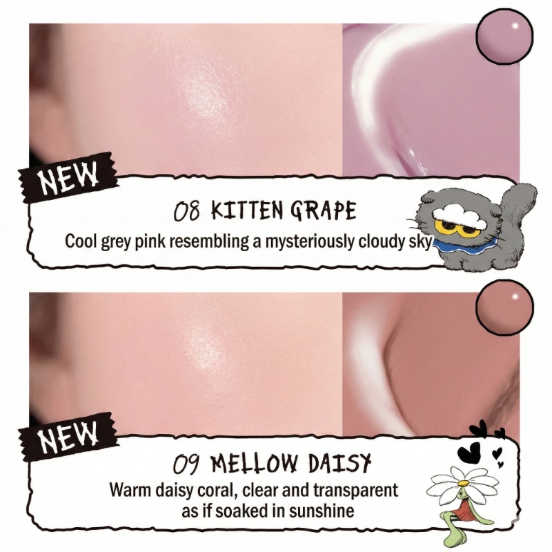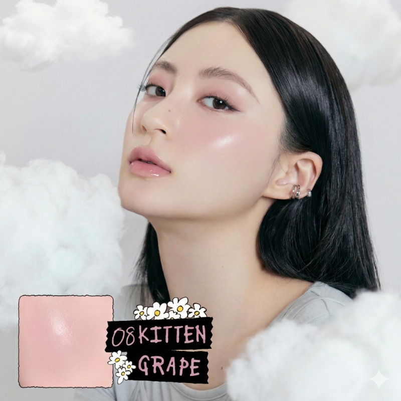 08 Kitten Grape: A soft, muted cool-toned grape shade. Perfect for those with cool undertones, this color brightens the complexion and adds a chic, ethereal vibe to the cheeks.