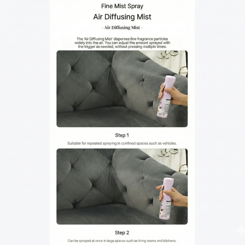2. Evenly spray from about 20–30cm away to certain space or fabric for deodorization.