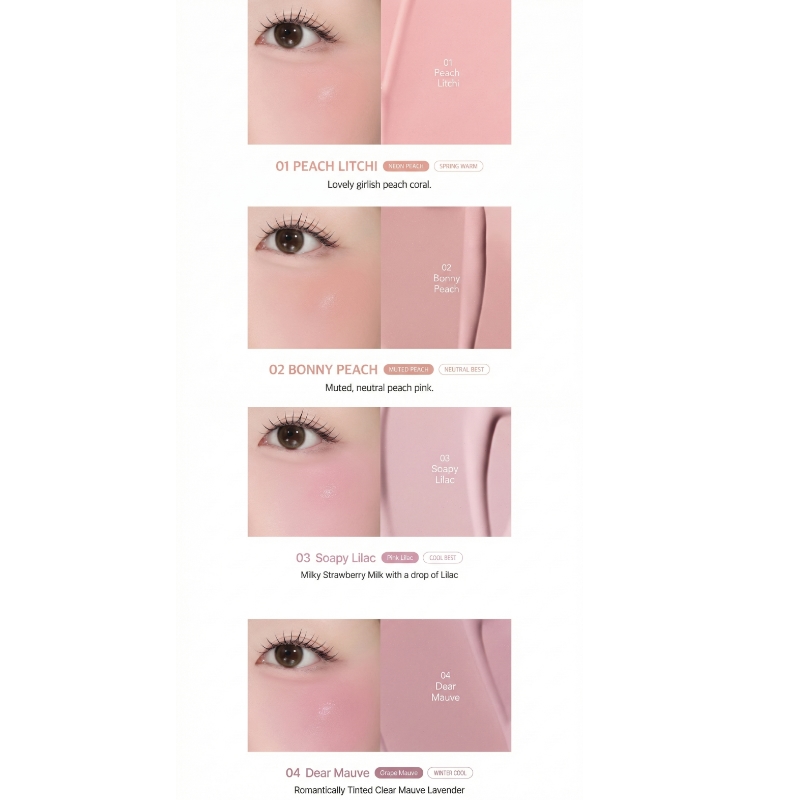 | Colour | 01 Peach Lychee, 02 Bony Peach, 03 Soapy Lilac, 04 Dear Mauve |