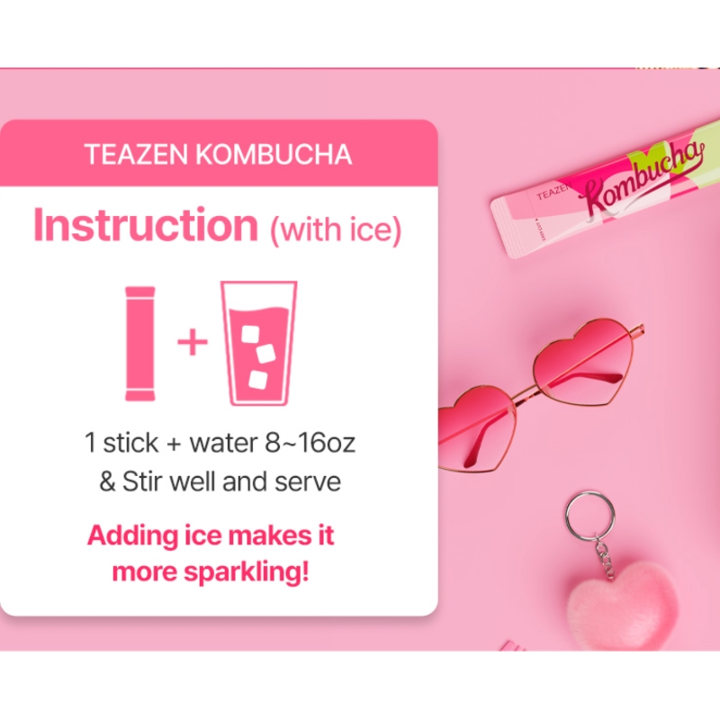 1 stick + 200ml of water + 150g of ice.*When Kombucha powder meets water, it creates bubbles. If you drink it directly from a water bottle, please drink 2–3 sips in advance to avoid spillover by creating enough empty space.