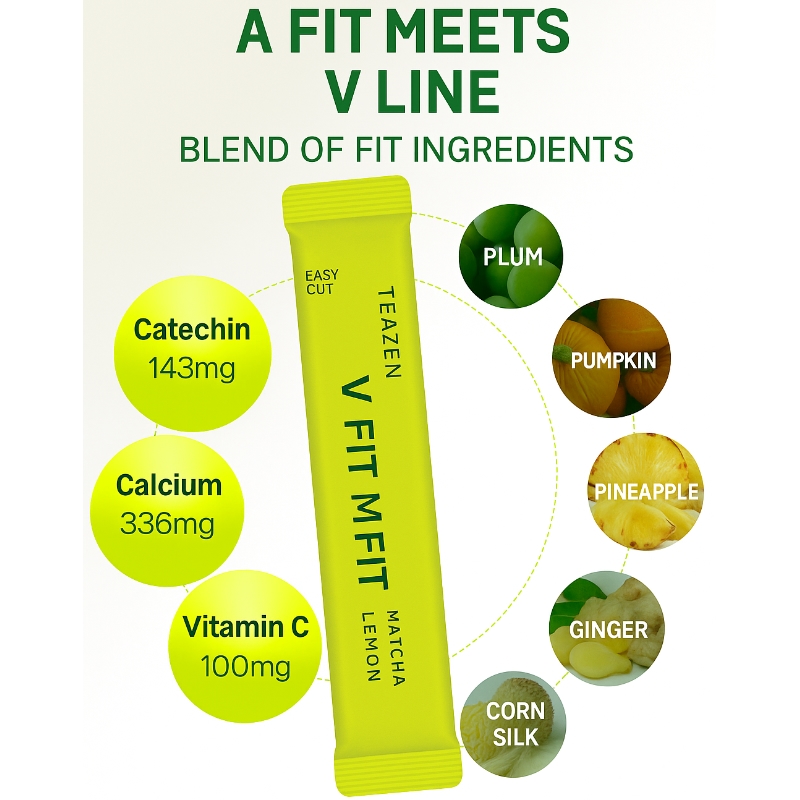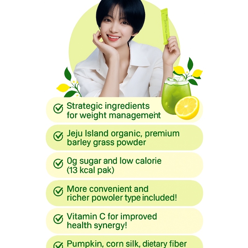 Matcha 25% (Jeju, Korea), Ctric Acid, Potassium Citrate, Chicory Dietary Fiber (100% Chicory Root Extract, Netherlands), Lemon Juice Powder 5%{Lemon Juice (100% Lemon Juice, USA) 72.88%, Dextrin, Ctric Acid, Gum Arabic}, Fragrance, Tea Catechin, Vitamin C, Cucurbita Pepo (Pumpkin) Fruit Extract Powder, Corn Silk Extract Powder, Sucralose (Sweetner), Green Plum Extract Powder, Ginger Concentrate Powder Pineapple Juice Powder