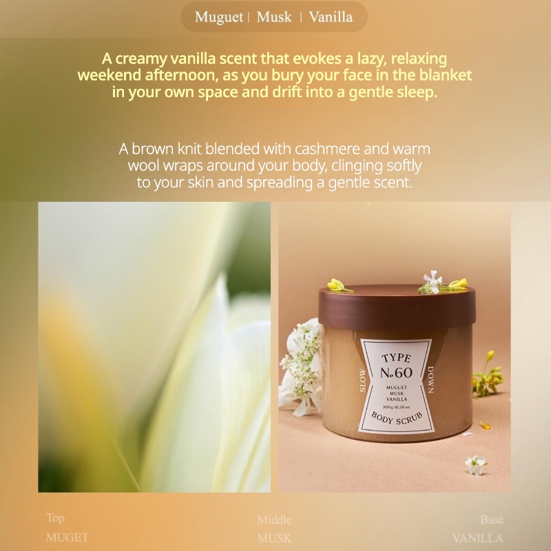 Wrap yourself in the comfort of a lazy weekend afternoon. This body scrub features a warm, powdery blend of Muguet, Musk, and Vanilla that calms the senses and relaxes the mind. It is the perfect self-care treat for unwinding after a long day, turning your shower into a sanctuary of softness.