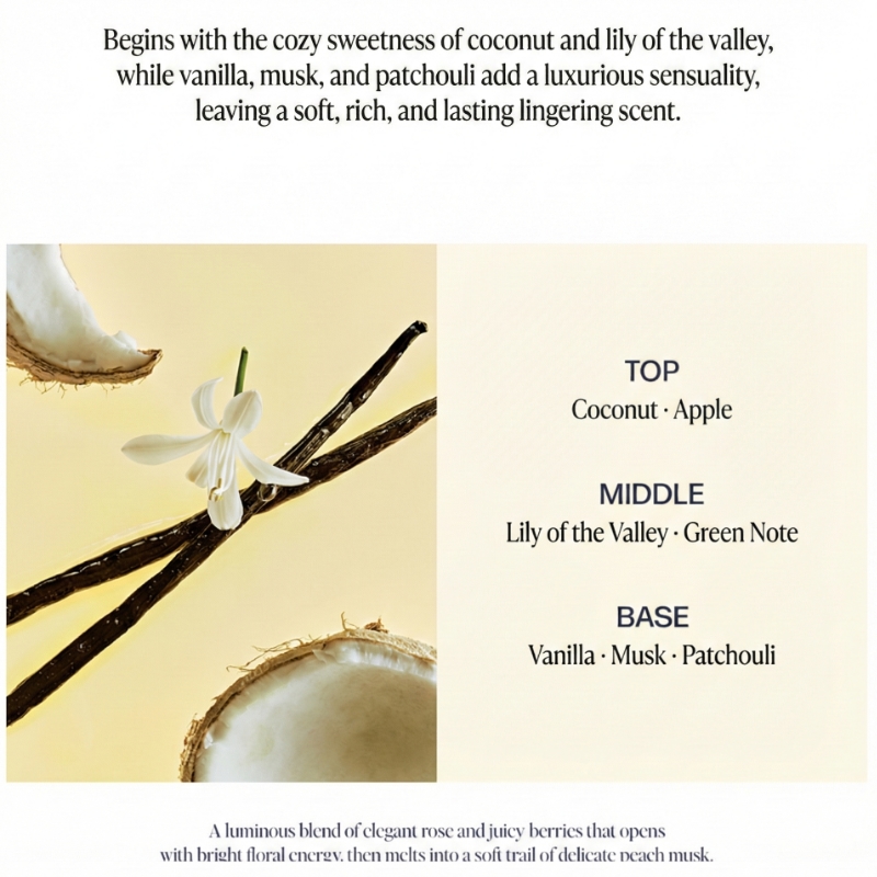 Notes: Vanilla, Soft Coconut, Warm Woods, Musk.