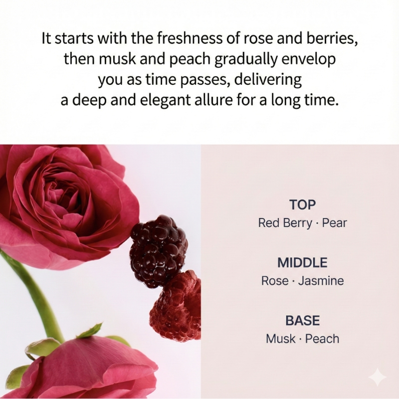 Notes: Fresh Rose, Red Berries, Jasmine, Musk.