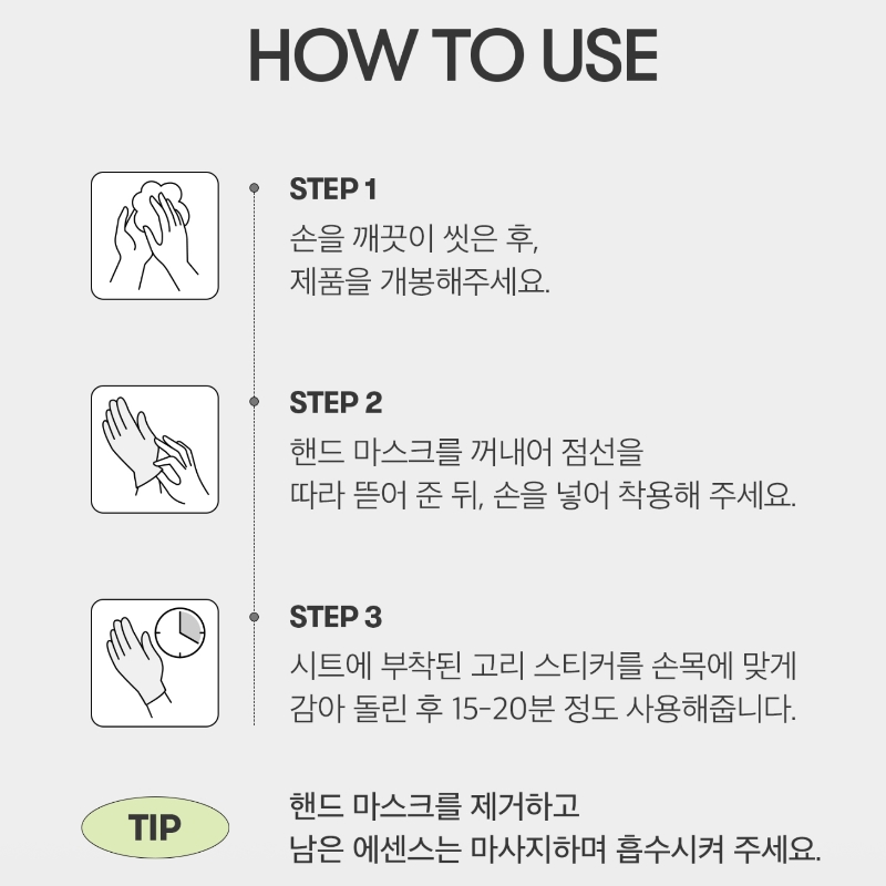 - Finish: Remove the glove masks and gently massage the remaining essence into your hands and up your wrists until fully absorbed. Do not rinse.